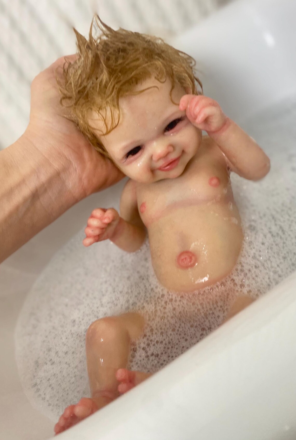 Hyperrealistic Features: Soft mohair hair, open mouth with tongue, tiny fingernails, delicate eyelashes, and lifelike skin tones.