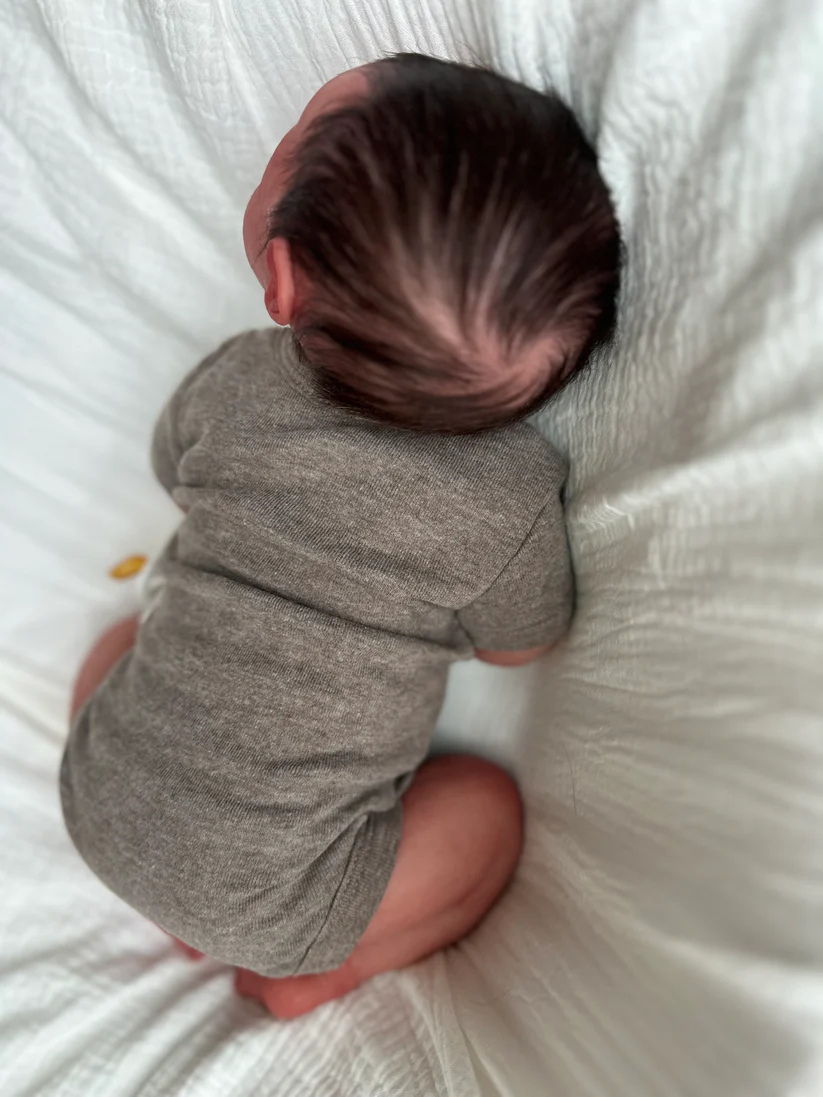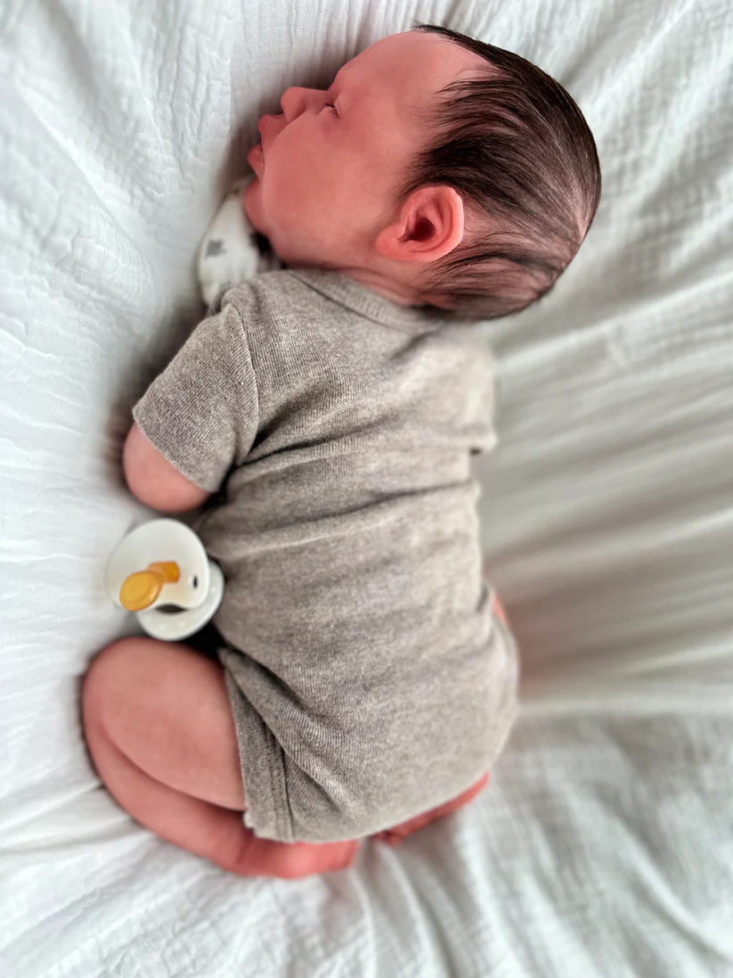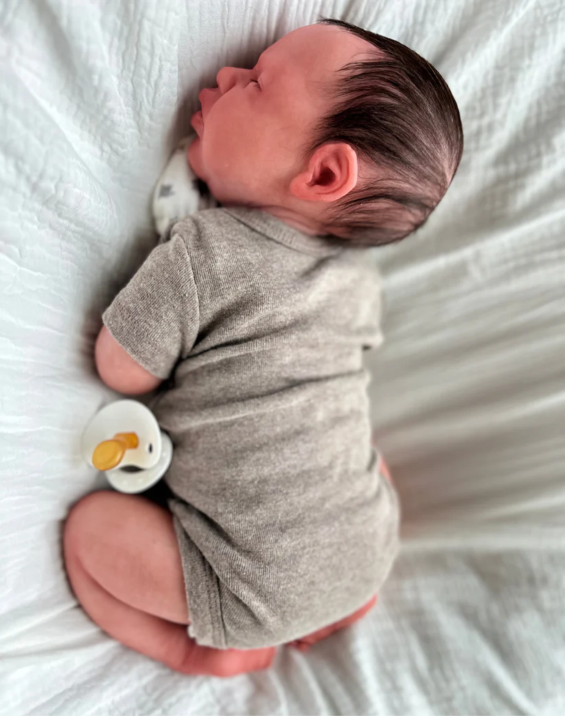 This is baby OLIVER! hand sculpted, poured, painted and rooted into pure cuddle perfection. He is the perfect newborn size measuring in at Approx. 18–22 inches (Newborn size) with his scrunched legs and weighing in at 3–5 lbs (Realistic newborn weight)! Who wants a weighted blanket to calm them when a perfectly weighted baby is so much cuter!?